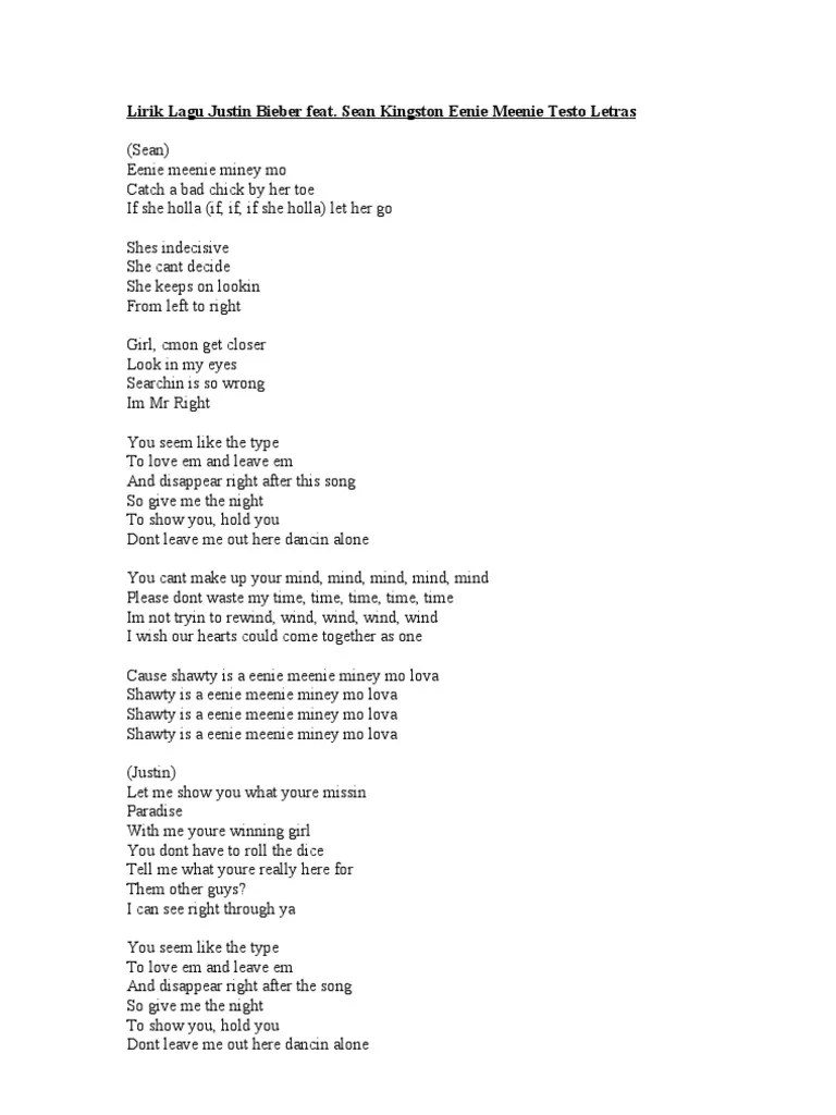 Sean kingston dalam terjemahan bahasa indonesia. Eenie meenie mini mo gonna miss you that i know akan merindukanmu yang aku tahu Lagu yang dirilis pada 19 maret 2010 silam pada album my world 2.0 (album kedua justin bieber). Download lagu eenie meenie sean kingston justin bieber lirik lagu terjemahan you seem like the type to love (3.49 mb) dan streaming kumpulan lagu eenie . Lagu ini berjudul eenie meenie yang kolaborasi dengan penyanyi reaper senior terkenal sean kingston, lagu kekinian ini wajib sih kalian kepoin .